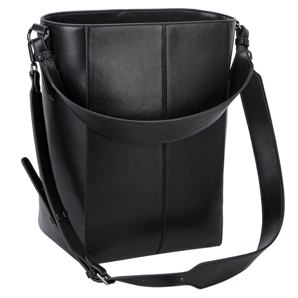 Bucket bag with bag shoulder strap, a long adjustable strap and zip closure. The bag contains one compartment with two inner pockets and one inner zip pocket. H35,5 cm x W25 cm x D17,5 cm