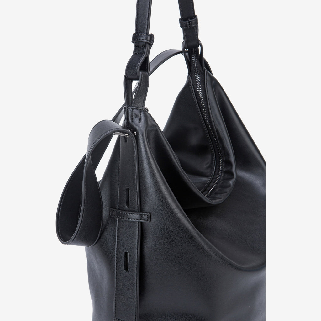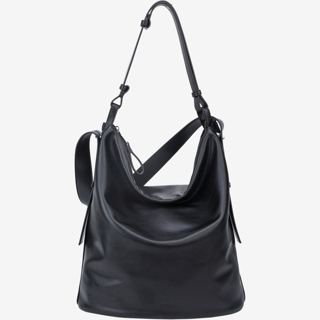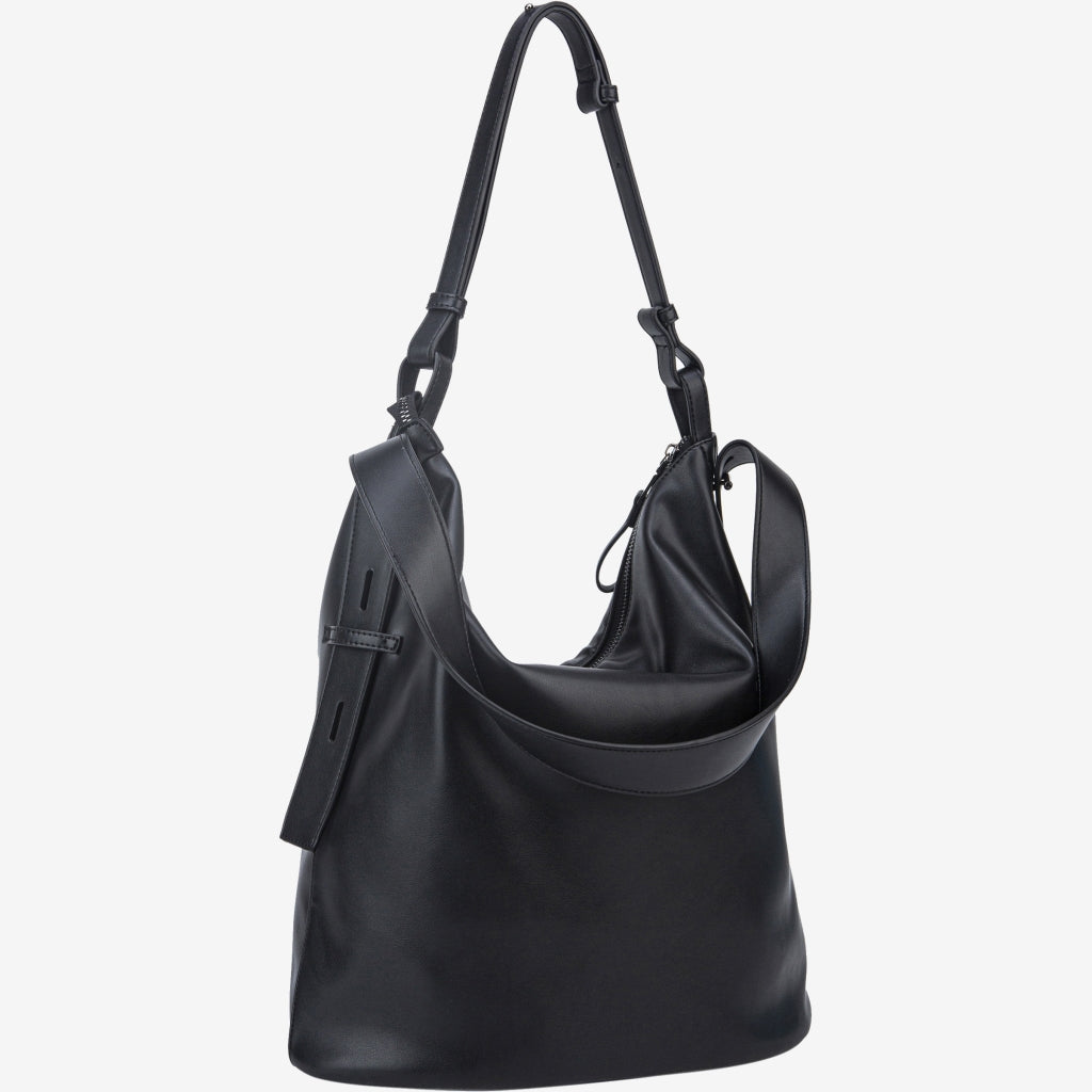 Crossbody bag with zip closure, adjustable shoulder strap and a longer attachable adjustable strap. The bag has one large compartment with two open inner pockets and one inner zip pocket. H37 cm x W45 cm x D20 cm