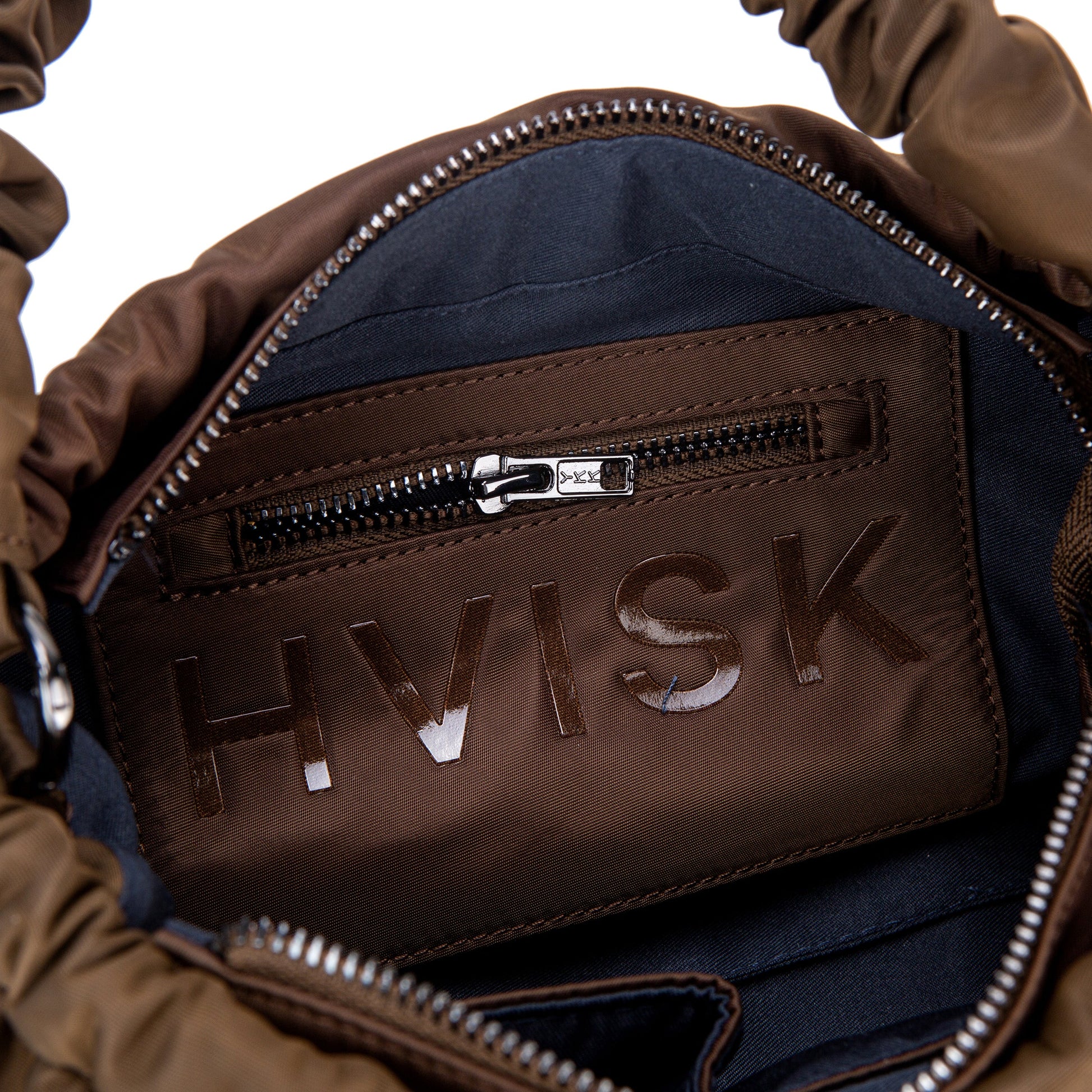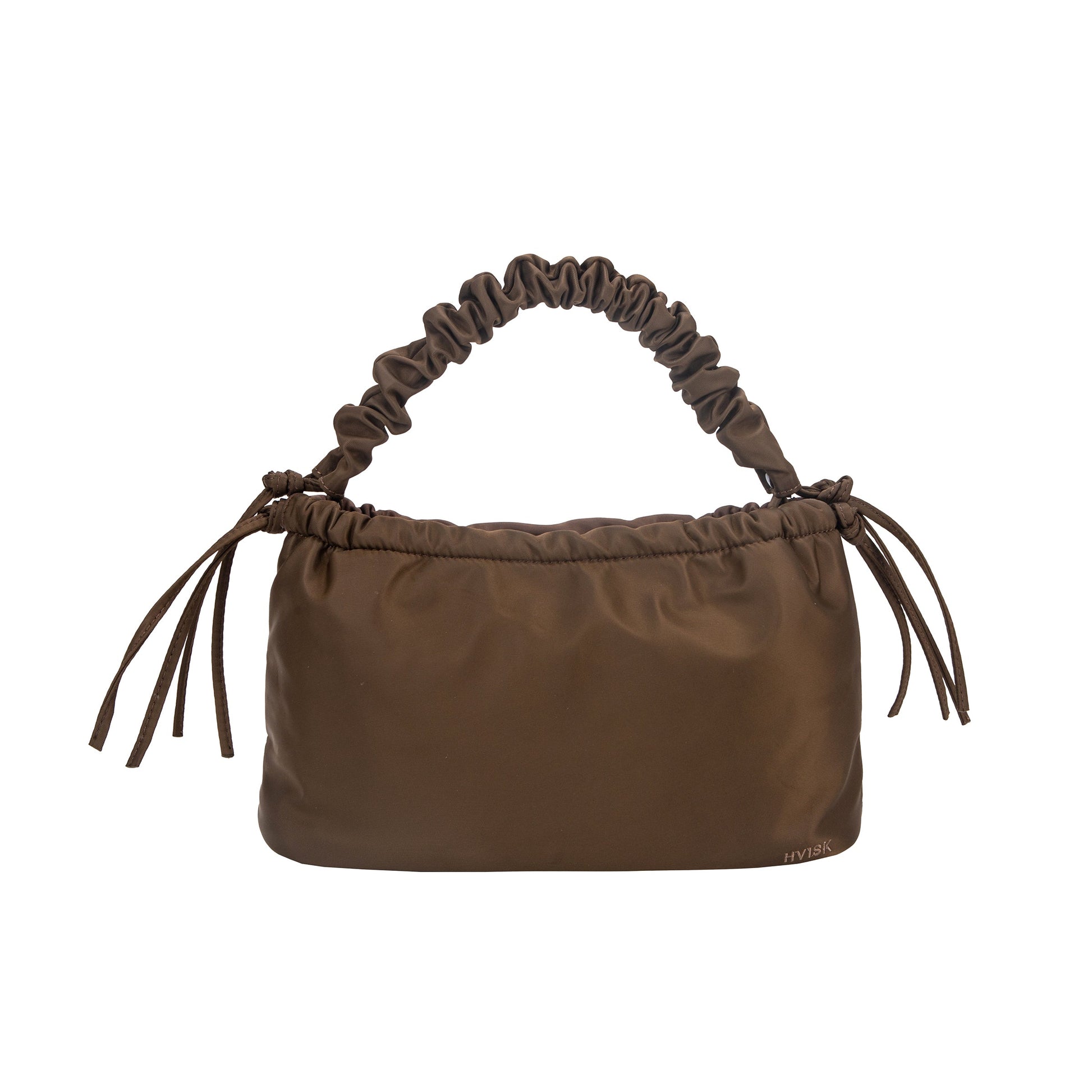 Shoulder bag with wrinkled detailing on the handle, string details and zip closure. It contains one main compartment with two small inner pockets and one zip pocket. It comes with an attachable crossbody strap.