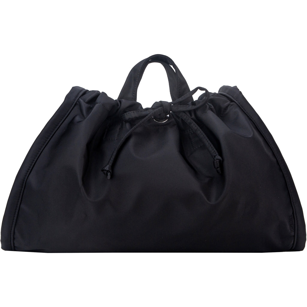 Shopper bag with drawstring closure and magnetic fastener. It has both short and longer handles and one main compartment along with an inner zip pocket.
