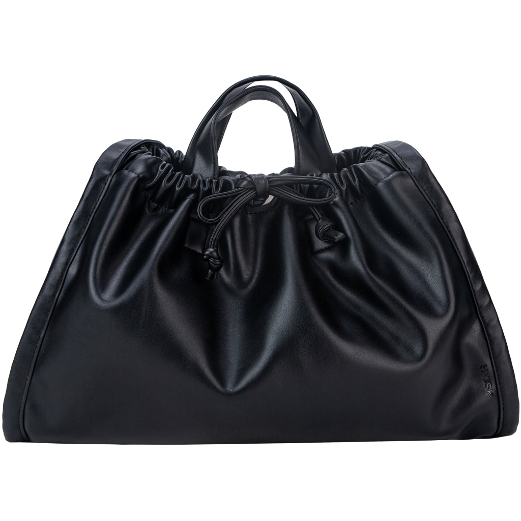 Shopper bag with drawstring closure and magnetic fastener. It has both short and longer handles and one main compartment along with an inner zip pocket.