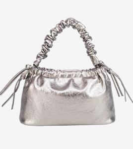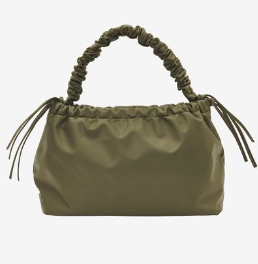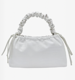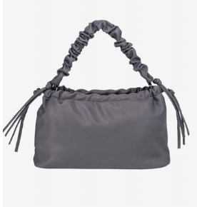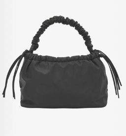 Shoulder bag with wrinkled detailing on the handle, string details and zip closure. It contains one main compartment with two small inner pockets and one zip pocket. It comes with an attachable crossbody strap.