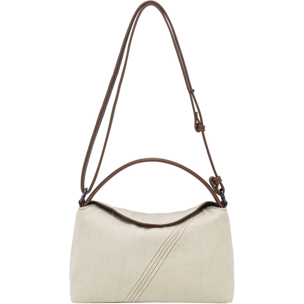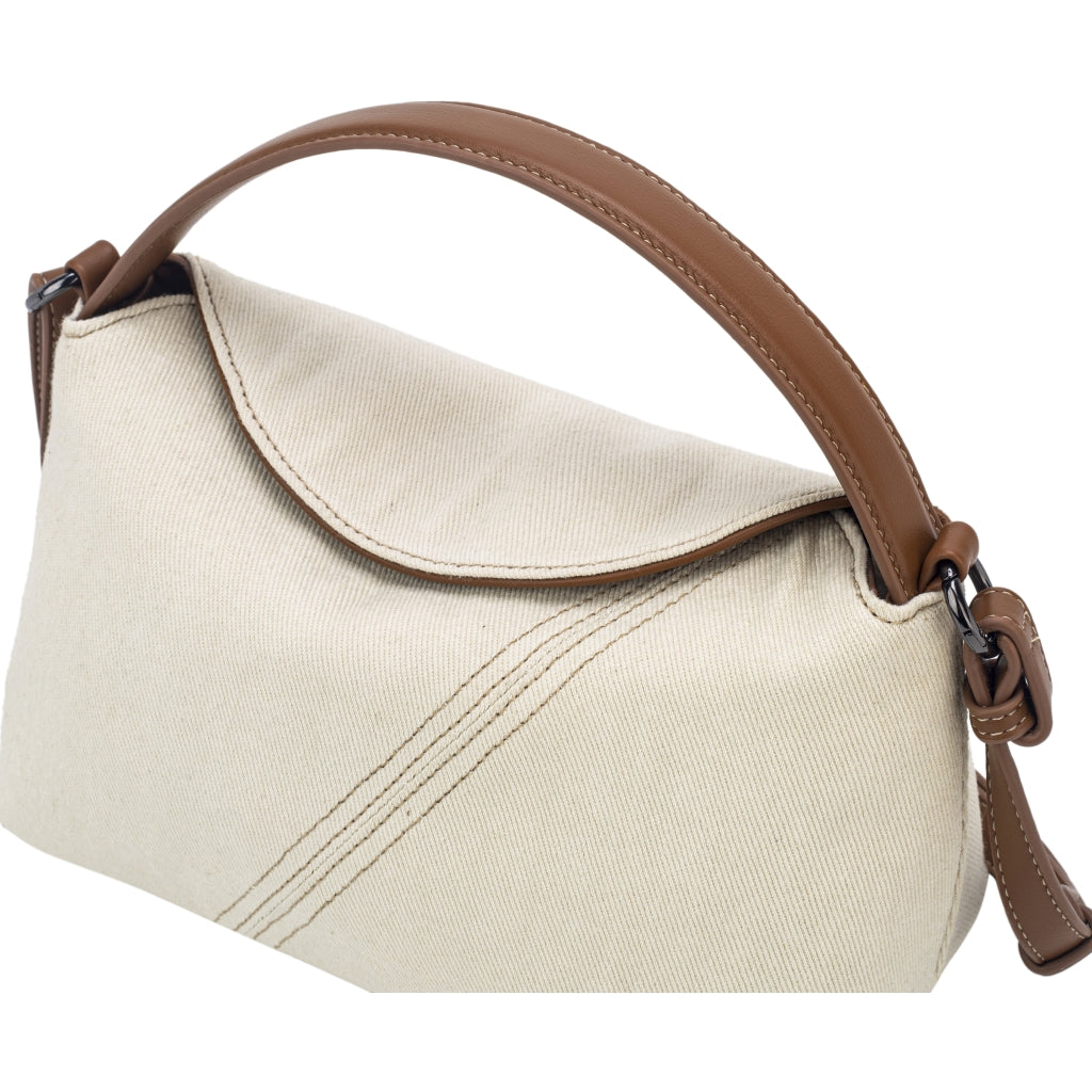 Handle bag with a short handle and a longer attachable adjustable strap. The bag has one large compartment and a small zipper pocket inside. A short flap with two magnetic buttons closes the bag. H15cm x W25cm x D12cm