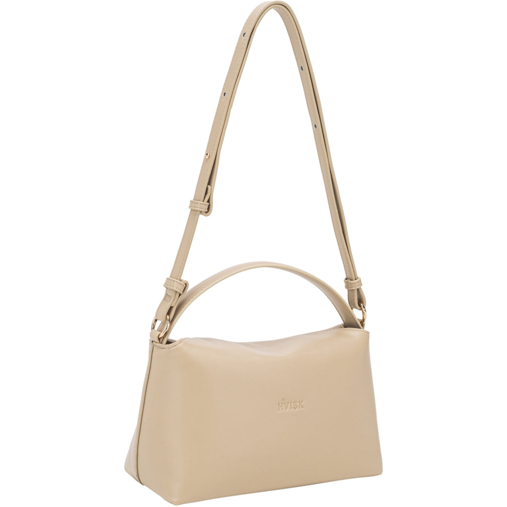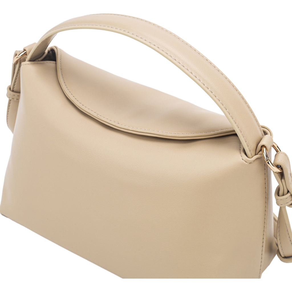 Handle bag with a short handle and a longer attachable adjustable strap. The bag has one large compartment and a small zipper pocket inside. A short flap with two magnetic buttons closes the bag. H15cm x W25cm x D12cm