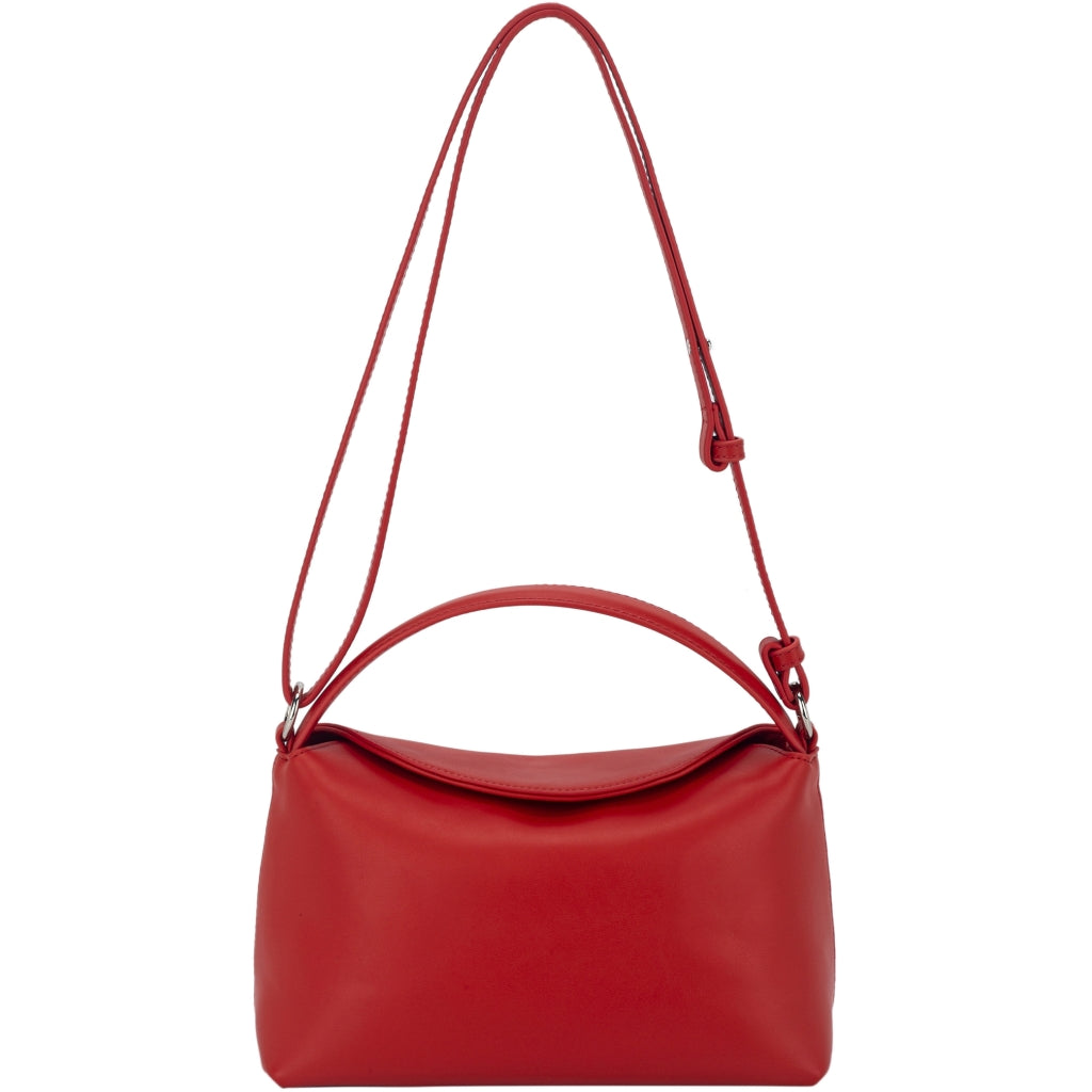 Handle bag with a short handle and a longer attachable adjustable strap. The bag has one large compartment and a small zipper pocket inside. A short flap with two magnetic buttons closes the bag.