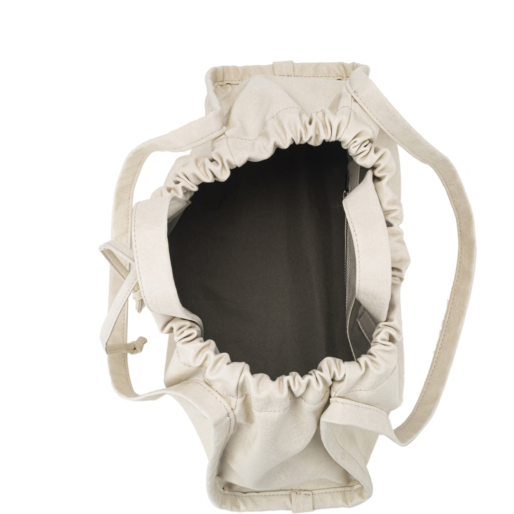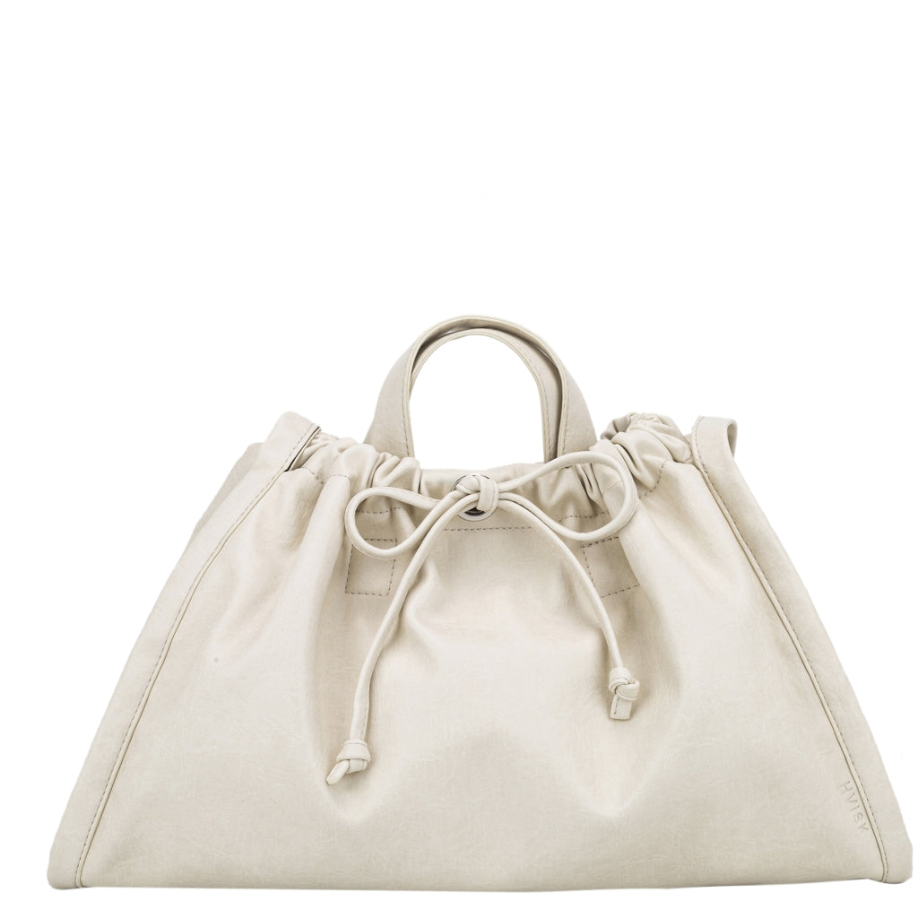Shopper with drawstring closure and magnetic fastener. It has both short and longer handles and one main compartment along with an inner zip pocket.