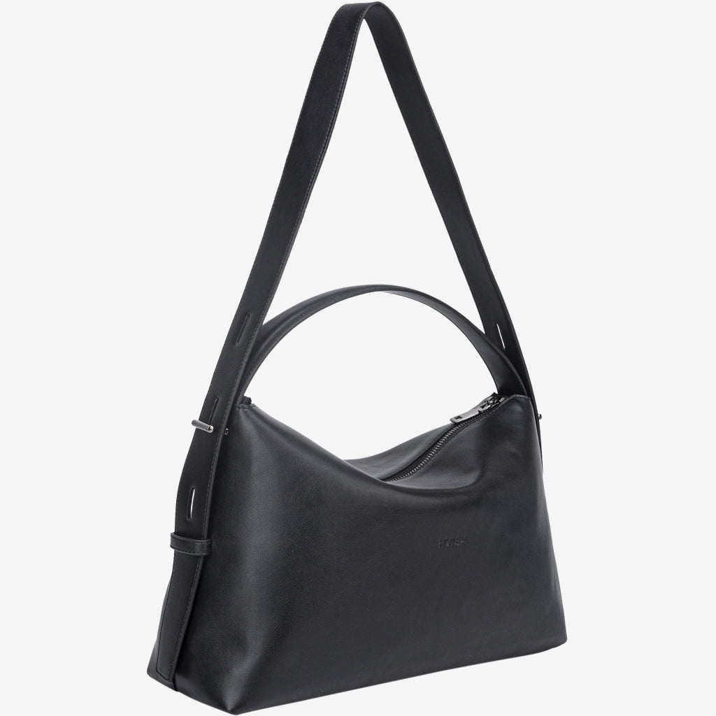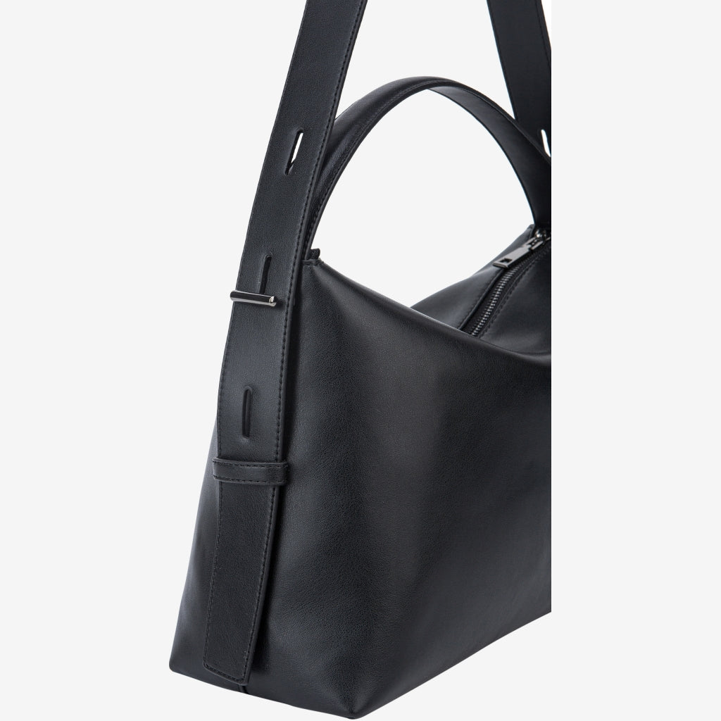 Handbag with zip closure, short handle and a longer attachable adjustable strap. The bag has one large compartment with two open inner pockets and one inner zip pocket. H21 cm x W35 cm x D12cm